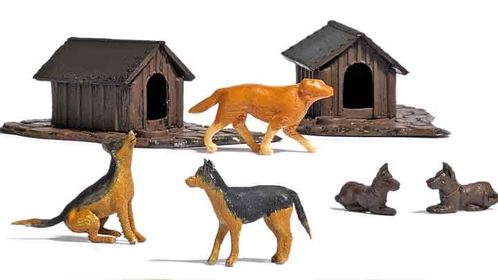 Набор окрашенных вручную фигурок 3 собак, 2 щенков и 2 будок. Набор для оформления территорий деревенских и дачных учасков, усадеб, сельских угодий, охраняемых объектов, военных баз и пограничных застав. Для установки фигурок рекомендуется использовать клей. Рекомендуется для диорам в масштабе 1/87 и железнодорожных макетов типоразмера Н0 (1:87).