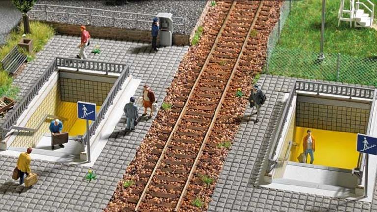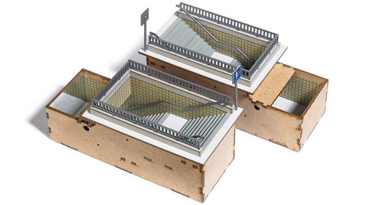 Набор для 2 пешеходных переходов. С круглыми перилами и информационным указателем на уровне улицы. Лестница с лестничной площадкой, поручнями и репликой из плиточных стен. Оптическое удлинение прохода через зеркала в подвале. Подсветка со светодиодной подсветкой 5998.