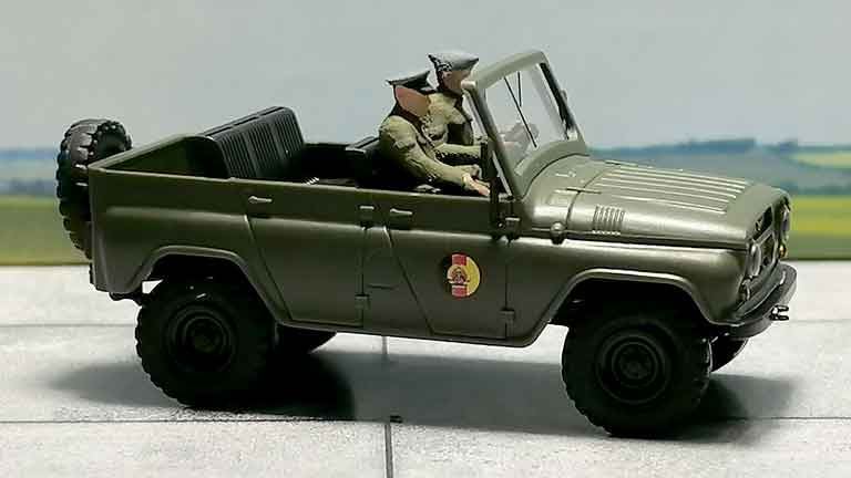 Масштабная модель легкового автомобиля УАЗ 469 с фигурками (NVA — Nationale Volksarmee) произведена в полном соответствии оригиналу в историческом и техническом плане. Окраска модели не требуется. Рекомендуется для диорам в масштабе 1/87 и железнодорожных макетов типоразмера Н0 (1:87).