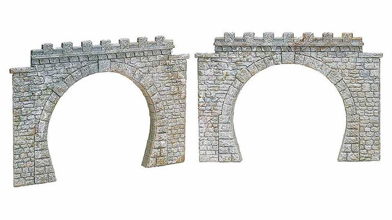 Масштабная модель двухпутного тоннельного портала из цветного пластика. Окраска модели не требуется. Размеры: 185× 133 × 3 мм, ширина у основания ~97 мм, высота арки ~100 мм. Упаковка — 2 арки. Рекомендуется для диорам в масштабе 1/87 и железнодорожных макетов типоразмера Н0 (1:87).