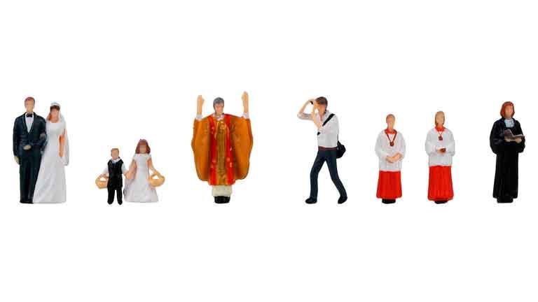 Набор окрашенных вручную фигурок «Молодожены со священником» из пластика. Рекомендуется для железнодорожных макетов типоразмера H0. Для установки фигурок рекомендуется использовать клей. Возможно размещение в любом месте макета или диорамы.