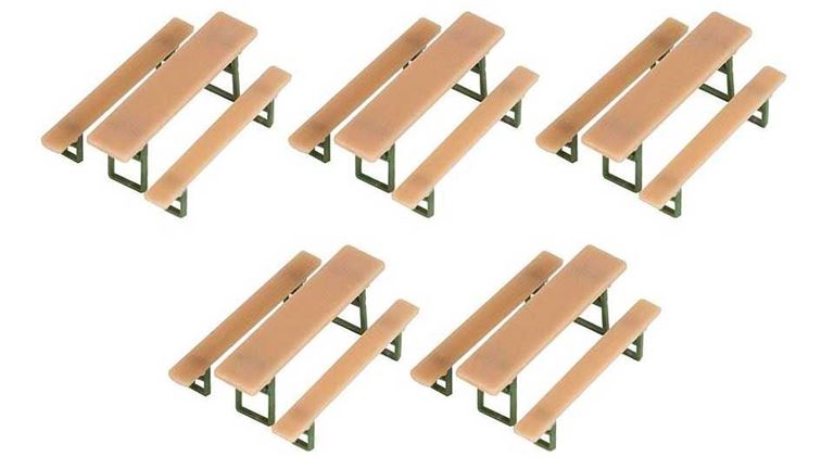 Масштабная модель «Пивные столы и скамейки» (5 шт.) из цветного пластика для самостоятельной сборки. Окраска модели не требуется. Клей в набор не входит. Рекомендуется для диорам и железнодорожных макетов в масштабе 1:87 типоразмера Н0.